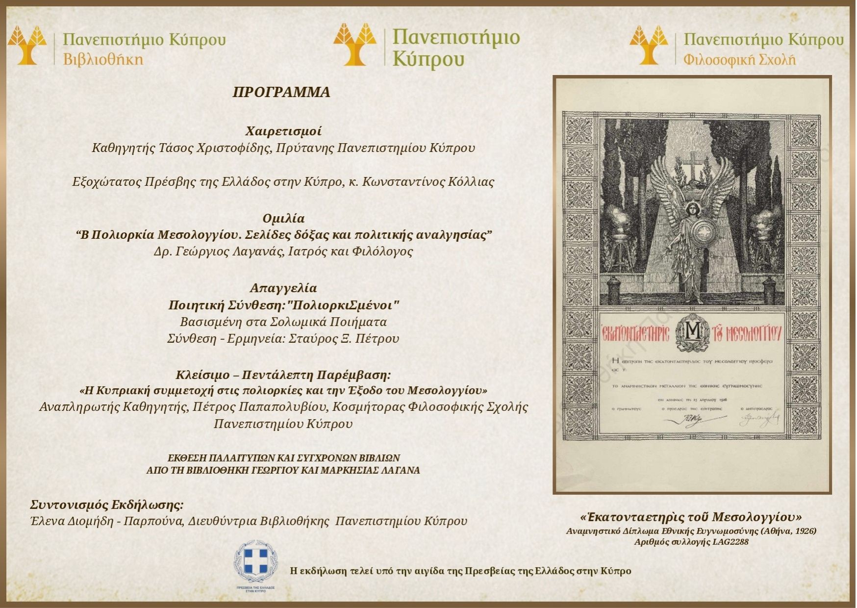 Η εκδήλωση θα κλείσει με πεντάλεπτη παρέμβαση του Κοσμήτορα της Φιλοσοφικής Σχολής Πέτρου Παπαπολυβίου, με μια επιγραμματική αναφορά στη συμμετοχή Κυπρίων αγωνιστών στο Μεσολόγγι και στην απήχηση της πολιορκίας και της Εξόδου στην Κύπρο τα τελευταία 200 χρόνια. Ενδιάμεσα, θα απαγγείλει ποίημά του, εμπνευσμένο από τα σολωμικά ποιήματα, ο Σταύρος Ξ. Πέτρου.